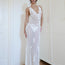 Onze jurk is delicaat ontworpen voor jou om te dragen tijdens je huwelijksreis, speciale gelegenheden en daarna. Een doorschijnende, lange jurk in het wit, met de hand afgewerkt met delicate bloemen door onze zeer bekwame ambachtslieden. Lage hals, hoge splitten met dubbele bandjes, gesneden in een chique zandloper silhouet.